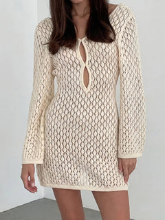 woman wearing a cream-colored crochet knit mini dress with long bell sleeves and a keyhole neckline