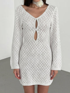 woman wearing a white crochet knit mini dress with long bell sleeves and a keyhole neckline