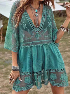 Woman wearing a teal lace cover-up with a V-neckline and tiered skirt.