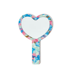 A heart-shaped hand mirror with a multi-colored tortoiseshell pattern and a white reflective surface.