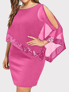 Elevate your wardrobe with this sophisticated knee-length dress, featuring a striking cold shoulder design and a graceful cape overlay. Crafted with shimmering sequins and a comfortable jersey knit blend, this piece offers both elegance and ease.