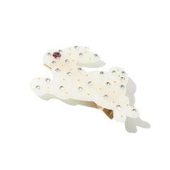 Close-up of white resin bunny hair clip with rhinestones and gold accents